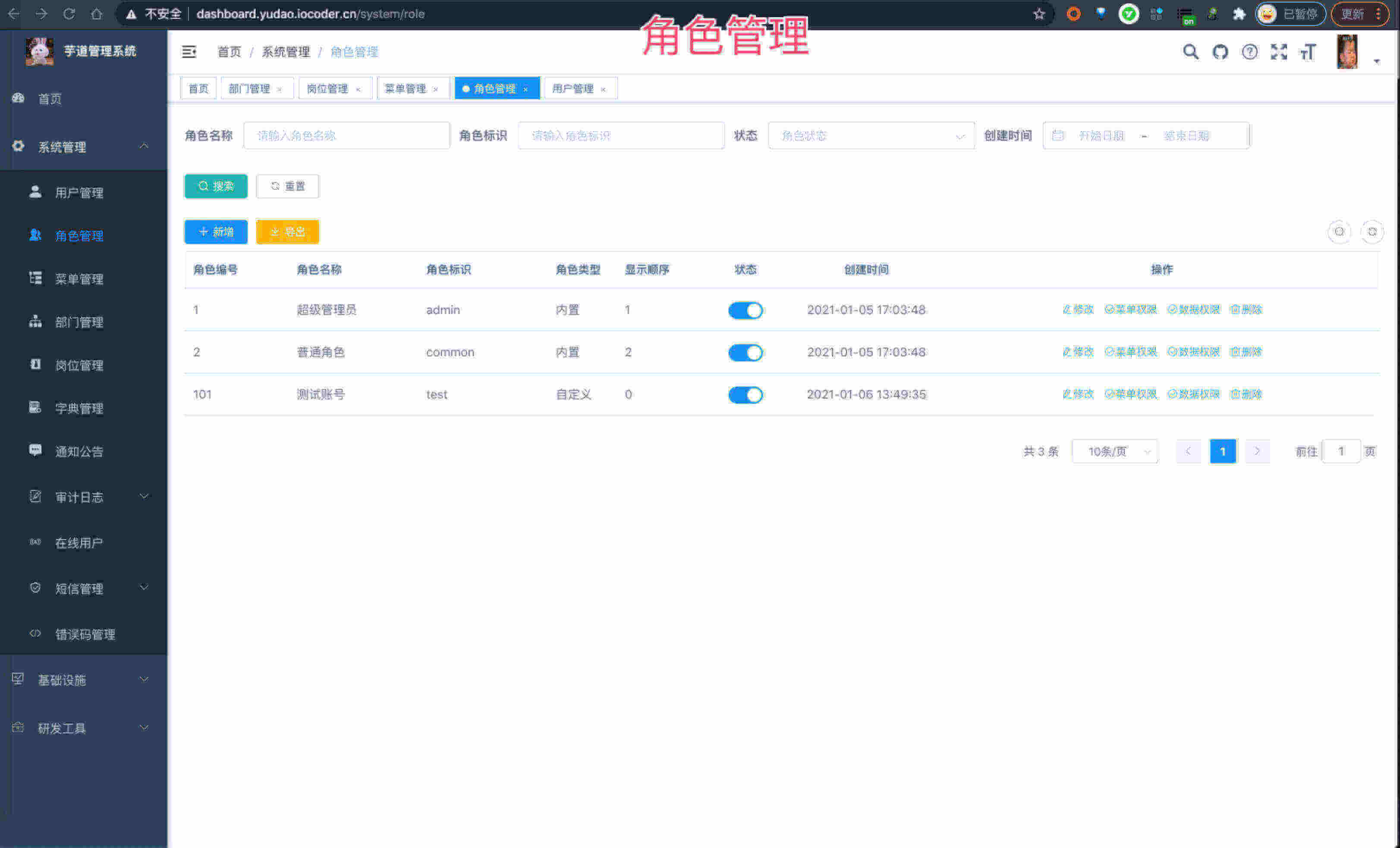 菜单管理 配置系统菜单、操作权限、按钮权限标识等,本地缓存提供性能