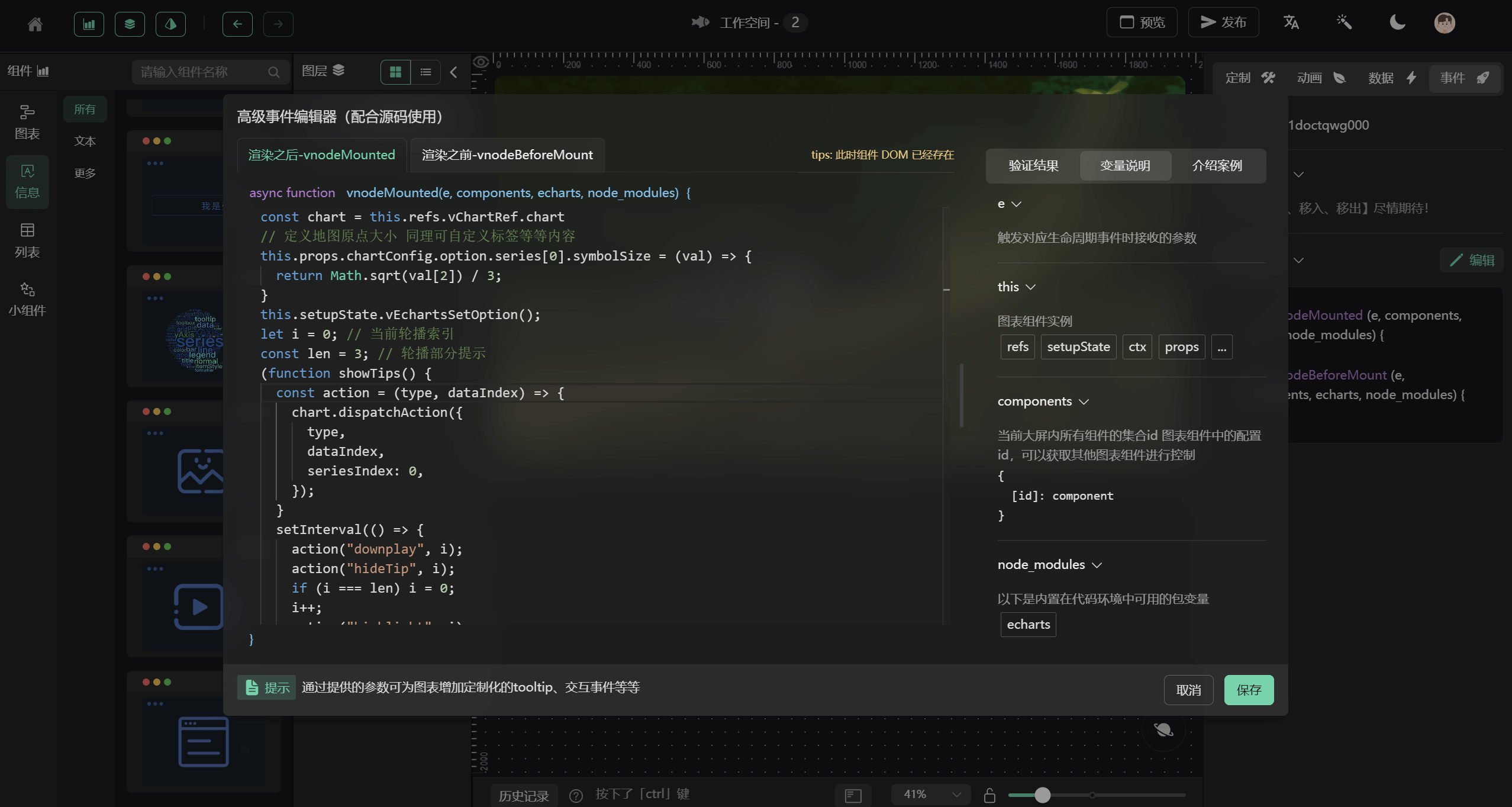 由 芋道 与 GoView 共同建设,基于 Vue3 搭建的低代码数据可视化开发平台,将图表或页面元素封装为基础组件,无需编写代码即可完成业务需求。
